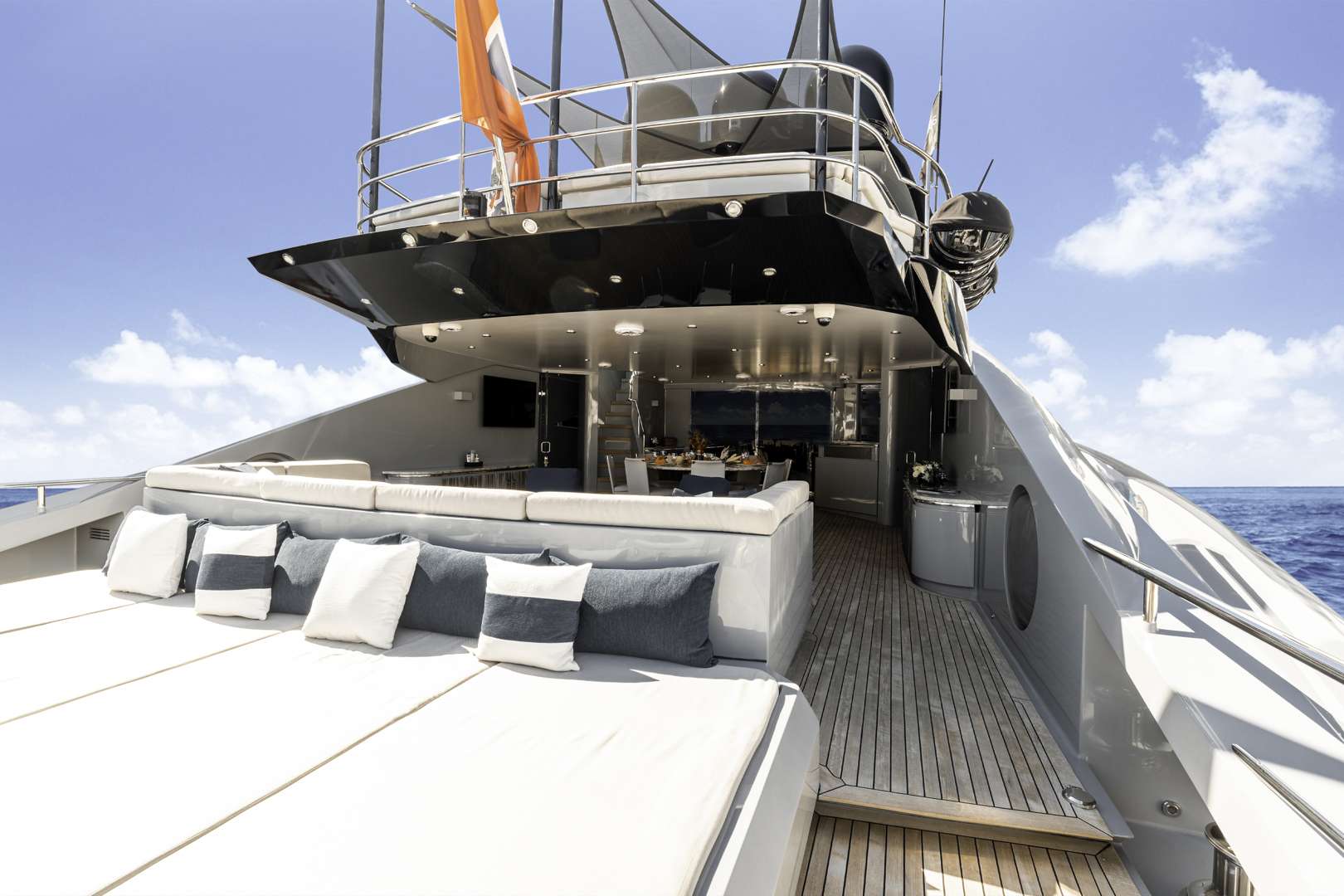 The exterior of M/Y Andiamo has also had a complete refresh of all upholstery, as well as a complete redesign of the bridge deck space. Starting aft, we have incorporated a sun pad fully integrated with the jacuzzi providing maximum sun space and comfort for those perfect Caribbean afternoons.