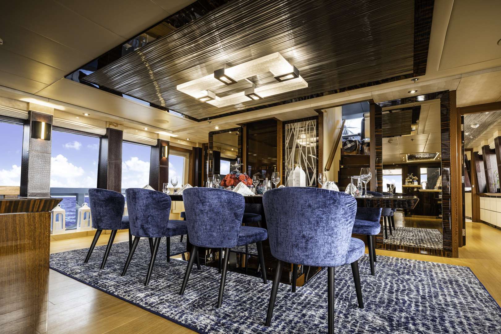 The interior of M/Y Andiamo has undergone a complete exchange of all soft goods with the addition of custom furniture, new upholstery, bed linens, and the intricate details of accent rugs and throw pillows all showcasing the new “Blue and White” theme of the interior’s design.