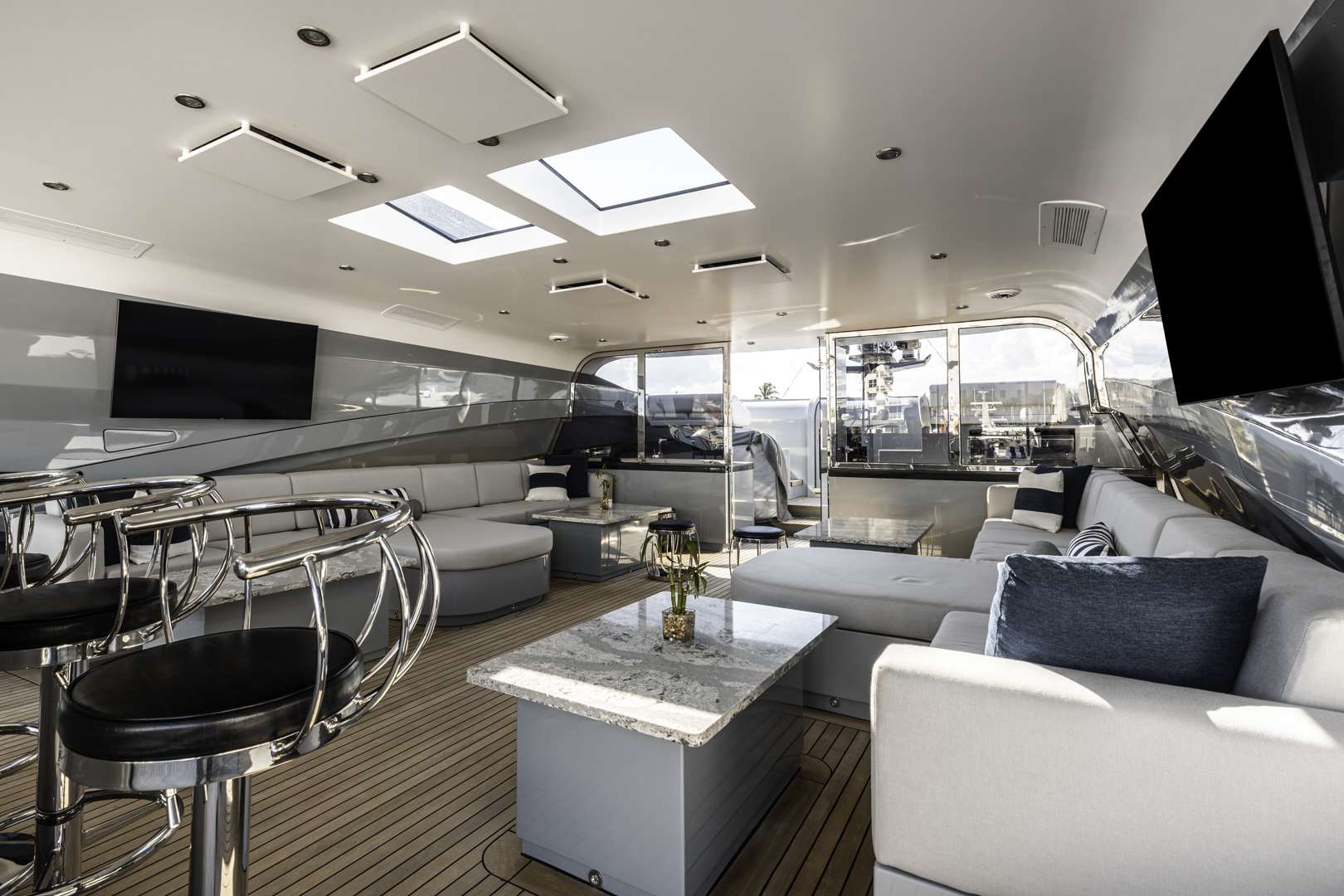 All of the interior and exterior TVs have been replaced with the latest 4K monitors supported by new 2019 HD Sat TV Receivers, Apple TVs, and the best sound system in the industry. There are multiple subwoofers on all decks and dozens of speakers for any audio-visual occasion.