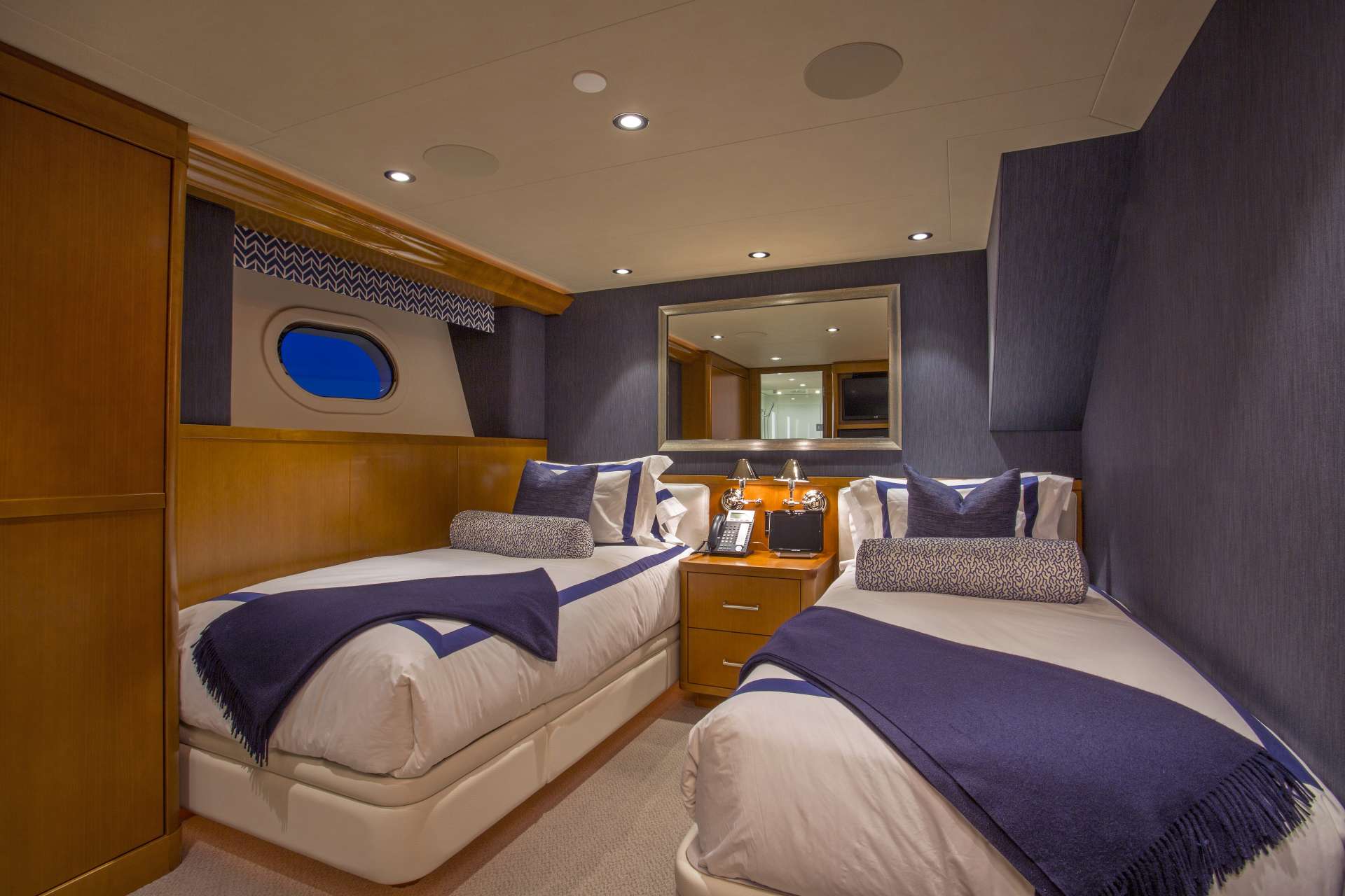 Twin Guest Stateroom (1): Midships, lower deck to port: Two single beds with night stand, dresser, and closet. The ensuite features a head, sink and a shower. The entertainment center has a 26” Blu-ray TV, DVD/CD, iPod dock, and surround sound.