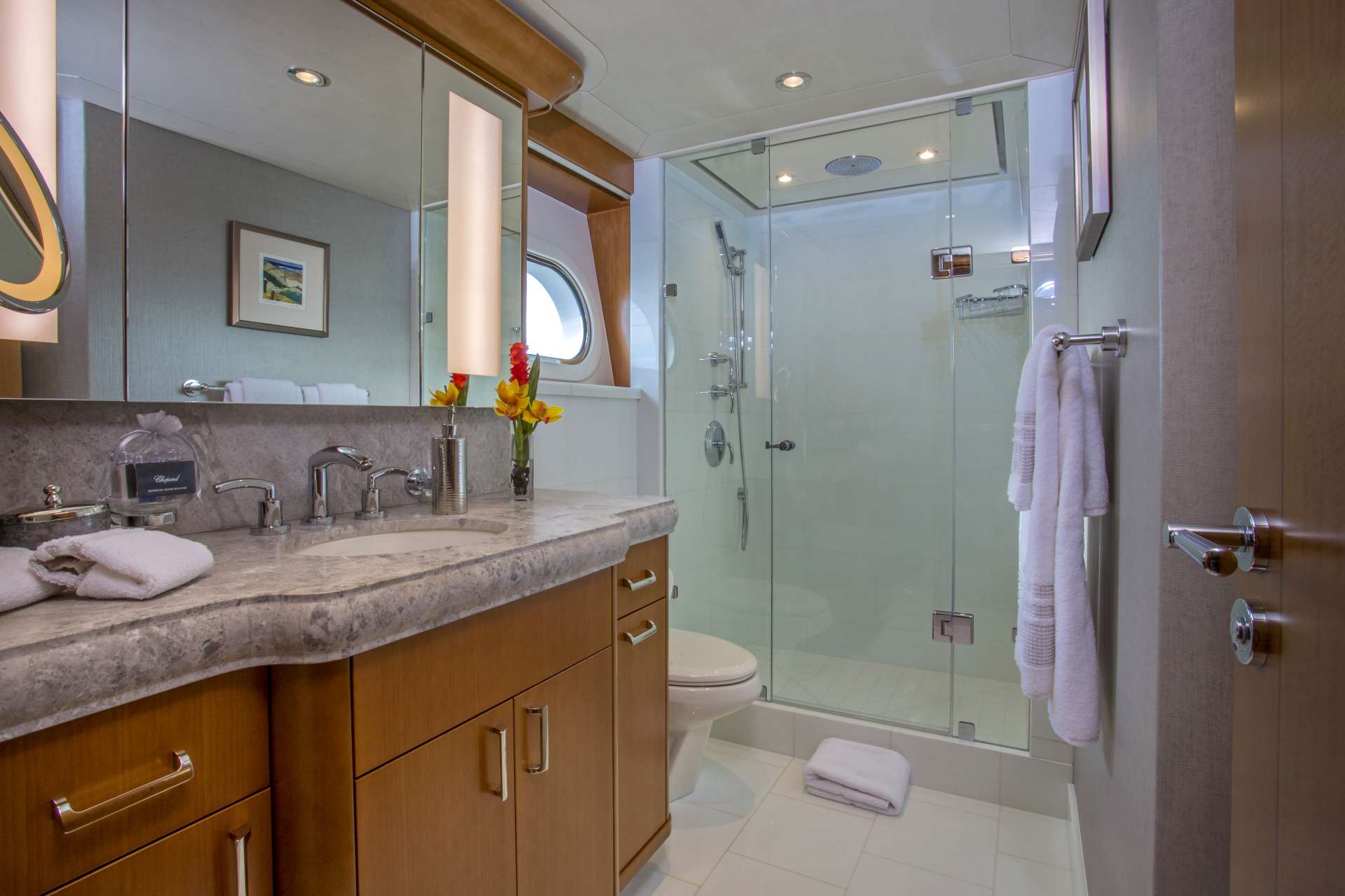 Master Stateroom: Main Deck, forward: Centerline king bed facing aft with two nightstands, dresser, vanity with mirror, safe, and his-and her-walk-in closets. The ensuite features a private head and bidet locker, a spacious shower, and twin sinks. Entertainment center with 42” Blu-ray TV, DVD/CD, iPod dock, and surround sound. There is a study adjacent to the Master Stateroom.