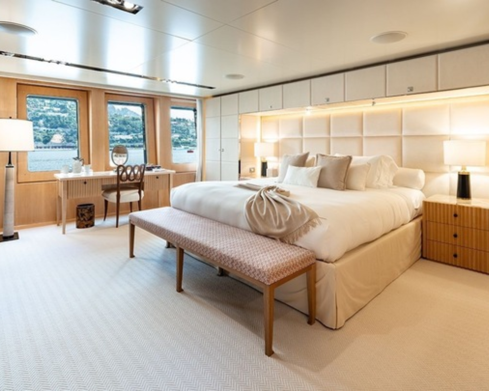 Owner’s duplex suite reached either by the lobby on the main deck or via the study/lounge on the upper deck. The suite has 2 temperate controlled walk in dressing rooms located of the entrance corridor, forward is the main cabin and master en-suite incorporating bath, double sink unit, shower and toilet. Private staircase to the study/lounge on the upper level.